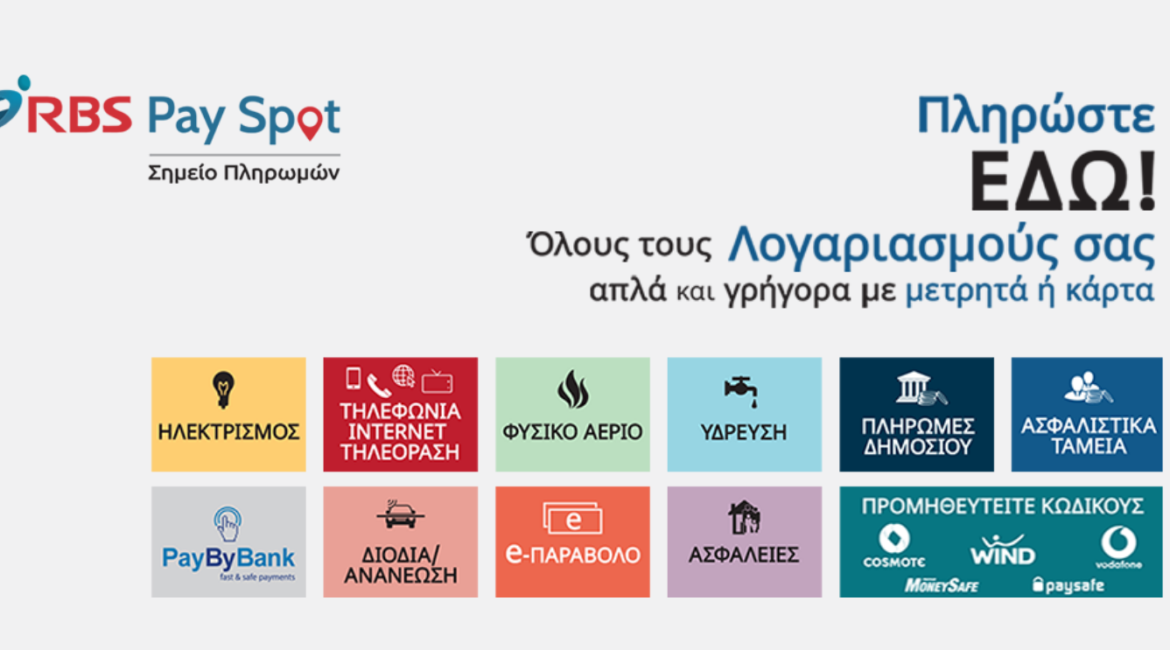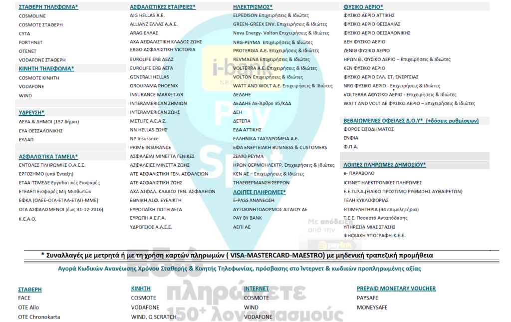 Εξοφλήστε στο κατάστημα μας ΑΜΕΣΑ και ΓΡΗΓΟΡΑ πάνω από 300 είδη λογαριασμών και οφειλών Δημοσίου, μέσω της υπηρεσίας i-bank Pay Spot της Εθνικής Τράπεζας της Ελλάδος, με μετρητά ή κάρτα.